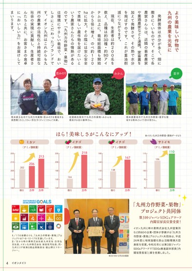 より美味しい作物で九州の農業を元気に発酵菌体は水分が多く、畑に撒きにくいものです。そこで各農家さんらは、近隣の畜産農家や養鶏農家などと連携。家畜糞を加えて発酵させ、その熱で水分を飛ばすのです。これが重油削減につながります。ha0種・約9現在、生産者は約200名を0アイ数え、品種は約3テム以上に。栽培総面積も開始から5倍に増え、のべ約120に拡大。その陰には安心安全で美味しい農作物を届けたいという農家さんたちの情熱があるのです。「九州力作野菜・果物」は環境にやさしい栽培で、おいしさにこだわったブランドです。イオン九州はこれからも九州の農業の活性化と持続可能な社会の実現に貢献し、生産者さんたちと共に、お客さまの食卓に「おいしい力」をお届けしてまいります。恋みのりみかん里芋熊本県玉名市で九州力作果物・恋みのりを栽培する坂西賢(さとし)さん・京位子(けいこ)さんご夫婦。佐賀県佐賀市で九州力作果物・みかんを栽培する谷口善伸さん。熊本県菊池市で九州力作野菜・里芋を栽培する熊本どんぐり会の皆さん。ミカン213206イチゴ218イチゴ167※イオン九州力作野菜・果物データよりサトイモ11021/17の目標のうち、「九州力作野菜・果物」プロジェクトは7・8・12・17を支援しています。2/左から味の素株式会社前九州支社白羽弘支社長、イオン九州株式会社柴田祐司社長、同・九州エリア政策G商品貢献担当福山博久マネージャー。14イオン九州と味の素株式会社九州営業所など約60の企業・団体が参画する「九州力作野菜・果物」プロジェクト共同体は、平成26年度に地球温暖化防止活動環境大臣表彰を受賞。令和元年には第3回ジャパンSDGsアワードで「SDGs推進副本部長(内閣官房長官)」賞を受賞しました。※2019年12月20日撮影