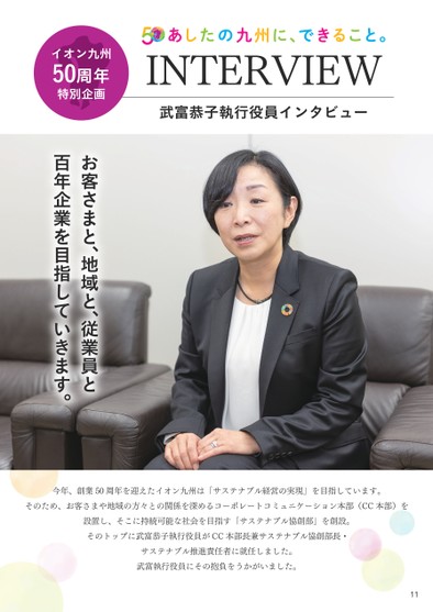 イオン九州50周年特別企画INTERVIEW武富恭子執行役員インタビュー今年、創業50周年を迎えたイオン九州は「サステナブル経営の実現」を目指しています。そのため、お客さまや地域の方々との関係を深めるコーポレートコミュニケーション本部(CC本部)を設置し、そこに持続可能な社会を目指す「サステナブル協創部」を創設。そのトップに武富恭子執行役員がCC本部長兼サステナブル協創部長・サステナブル推進責任者に就任しました。武富執行役員にその抱負をうかがいました。11お客さまと、地域と、従業員と百年企業を目指していきます。