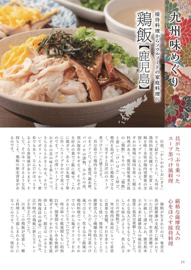 九州味めぐり接待料理からソウルフードの家庭料理に鶏飯【鹿児島】具がたっぷり乗ったスープ茶づけ風料理厳格な薩摩役人の心をほぐす接待料理11以前、「かしわめしおにぎり」でもご紹介したように、九州は鶏肉料理文化圏です。佐賀・長崎を除く各県が鶏肉消費量の全国トップテンに入るほど。それぞれの地域に鶏肉を使った郷土料理があり、鹿児島県奄美大島の「鶏飯」もその一つ。「鶏飯」と書いて「けいはん」と呼び、鶏肉を混ぜて炊いた鶏飯ではなく、一見すると具沢山のスープ茶づけといった感じです。具は茹でた鶏肉をほぐしたものをメインに、干し椎茸、錦糸卵、パパイヤの漬物、みかんの皮、刻み海苔やネギなど。それぞれを好みの量でご飯に載せ、これに鶏ガラ、あるいは丸鶏で丁寧に作ったスープをかけて食べるのです。コクの深いスープとそれぞれの具の味を楽しみつつ、さらさらとかきこめる。それでいてボリュームもしっかり。素朴でもあり、なんだかほっとするような食後感があります。そして、そのほっとするような気持ちこそ、鶏飯の歴史背景があるのです。鶏飯が生まれたのは、奄美大島が薩摩藩の支配下に置かれていた江戸時代。年貢の黒糖づくりが厳しく課せられ、鹿児島本土から来た薩摩役人の威圧的な態度に島民は委縮していました。そんな役人たちをもてなし、少しでも和らげようと、差し出されたのが鶏飯でした。実は鶏肉は島民にとって非常に貴重な食糧。それを余すところなく使い、接待に出すことで薩摩役人のご機嫌を取りなしたのです。ただし、当時は茶づけ風ではなく、炊き込みご飯風の鶏肉料理だったそうです。それではいつから鶏ガラスープをかけるようになったのでしょう。時は移って戦後間もない昭和年、開業間もないある旅館が鶏ガラスープをかける鶏飯を提供しました。館主は「ふるさと料理復活の研究」に打ち込み、江戸時代の鶏飯に新たなアレンジを加えたのでした。以来、この鶏飯が定着し、郷土料理として親しまれるようになったのです。さらに、現在の21
