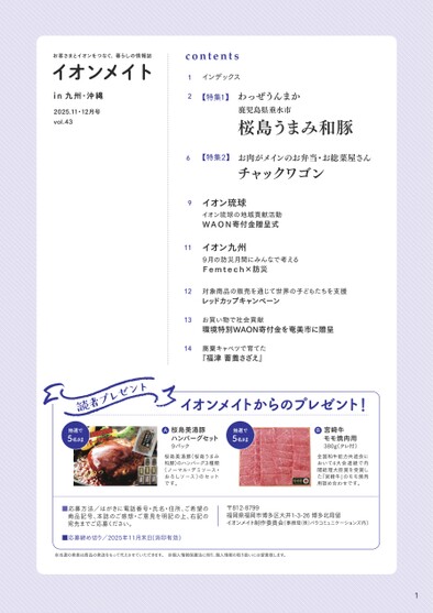 お客さまとイオンをつなぐ、暮らしの情報誌イオンメイトin九州・沖縄2025.11・12月号vol.43contents12インデックス【特集1】わっぜうんまか鹿児島県垂水市桜島うまみ和豚6【特集2】お肉がメインのお弁当・お総菜屋さんチャックワゴン911121314イオン琉球イオン琉球の地域貢献活動WAON寄付金贈呈式イオン九州9月の防災月間にみんなで考えるFemtech×防災対象商品の販売を通じて世界の子どもたちを支援レッドカップキャンペーンお買い物で社会貢献環境特別WAON寄付金を奄美市に贈呈廃棄キャベツで育てた『福津蓄養さざえ』抽選で5名さま抽選で5名さまA桜島美湯豚ハンバーグセット9パック桜島美湯豚(桜島うまみ和豚)のハンバーグ3種類(ノーマル・デミソース・おろしソース)のセットです。B宮崎牛モモ焼肉用380g(タレ付)全国和牛能力共進会において4大会連続で内閣総理大臣賞を受賞した「宮崎牛」のモモ焼肉用詰め合わせです。■応募方法/はがきに電話番号・氏名・住所、ご希望の商品記号、本誌のご感想・ご意見を明記の上、右記の宛先までご応募ください。〒812-8799福岡県福岡市博多区大井1-3-26博多北局留イオンメイト制作委員会(事務局(株)バウコミュニケーションズ内)■応募締め切り/2025年11月末日(消印有効)※当選の発表は商品の発送をもって代えさせていただきます。※個人情報保護法に則り、個人情報の取り扱いには留意致します。1