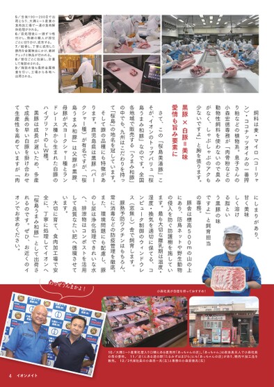 にしまりがあり、甘く美味しく溶ける脂という黒豚の味ですよ」と飼育担当の専務。飼料は麦・マイロ(コーリャン)・ココナッツオイルの一番搾り粕などの植物系。息子さんの小森宏徳専務が「肉骨粉などの動物性飼料を使わないので臭みがなく、しゃぶしゃぶのアクも少ないですよ」と胸を張ります。黒豚×白豚=美味愛情も旨み要素にさて、この「桜島美湯豚」こそが、イオンのトップバリュ「桜島うまみ和豚」なのです。全国各地域で販売する「うまみ和豚」の中でも、九州はこだわりを持って「桜島」の地名を冠しています。そして豚の品種にも特徴があります。鹿児島県は黒豚(バークシャー種)が有名ですが、「桜島うまみ和豚」は父豚が黒豚、母豚が大ヨークシャー種とランドレース種から生まれた白豚のハイブリットのLW種。黒豚は成長が遅いため、多産で成長の早い白豚を掛け合わせて生産性を高めていますが「肉5/生後190〜200日で出荷となり、大隅ミート産業の食肉加工場で一連の食肉解体処理がされる。6/前処理後に一頭ずつ格付けし、熟練の職人が部位ごとに切り分け、成形する。7/脱骨し、丁寧に成形した豚肉を金属検出にかけ、最終チェックと検品が行われる。8/部位ごとに包装し、計量して箱詰めされる。9/箱詰め後も最終金属検査を行い、工場から各地へ出荷される。89675豚舎は標高500mの山の上にあり、防鳥ネットや野生動物の侵入を防ぐ防護柵を施しています。最も大切な離乳期は温度・湿度・換気を適切に保てる、コンピュータ制御のウィンドウレス(窓無し)舎で飼育します。豚熱予防ワクチンはもちろん、常に消毒などの防疫管理を徹底。また、環境問題にも配慮し、豚のし尿は浄化処理できれいな水へ、排泄物はコンポストを活用して良質なたい肥へ循環させています。大切に育て、食肉加工場で安全に、丁寧に処理してイオンへ「桜島うまみ和豚」として出荷されるのです。ぜひ、お近くのイオンでお求めください。4小森社長が自信を持っておすすめ!111010/大隅ミート産業社屋入り口横にある直売所「あっちゃんの店」。「あっちゃん」は故会長夫人で小森社長の母の愛称。11/近くにある道の駅「たるみずはまびら」にも「あっちゃんの店」があり、精肉や加工品を販売。12/2代目社長の小森浩一氏(左)と専務の小森宏徳氏(右)4イオンメイト12