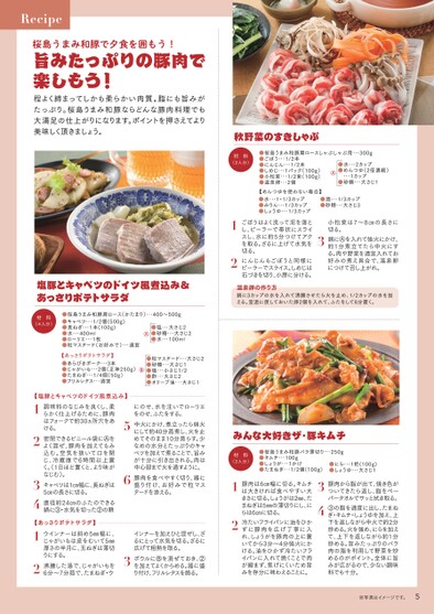 材料(2人分)●桜島うまみ和豚肩ロースしゃぶしゃぶ用・・・300g●ごぼう・・・1/2本●にんじん・・・1/2本●しめじ・・・1パック(100g)●小松菜・・・1/2束(100g)●温泉卵・・・2個【めんつゆを使わない場合】●水・・・1・1/3カップ●みりん・・・1/3カップ●しょうゆ・・・1/3カップ●酒・・・1/3カップ●砂糖・・・大さじ3●水・・・2カップ●めんつゆ(2倍濃縮)・・・1カップ●砂糖・・・大さじ1Ⓐ塩豚とキャベツのドイツ風煮込み&あっさりポテトサラダ12ごぼうはよく洗って泥を落とし、ピーラーで帯状にスライスし、水に約5分つけてアクを取る。ざるに上げて水気を切る。にんじんもごぼうと同様にピーラーでスライス。しめじは石づきを切り、小房に分ける。3小松菜は7〜8㎝の長さに切る。鍋にⒶを入れて強火にかけ、約1分煮立てたら中火にする。肉や野菜を適宜入れてお好みの煮え具合で、温泉卵につけて召し上がれ。温泉卵の作り方鍋に3カップの水を入れて沸騰させたら火を止め、1/2カップの水を加える。室温に戻しておいた卵2個を入れて、ふたをして8分置く。※写真はイメージです。5豚肉から脂が出て、焼き色がついてきたら返し、脂をペーパータオルでサッと拭き取る。③の脂を適度に出し、たまねぎ・キムチ・しょうゆを加え、上下を返しながら中火で約2分炒める。火を強め、にらを加えて、上下を返しながら約1分炒める。旨みたっぷりのバラ肉の脂を利用して野菜を炒めるのがポイント。全体に旨みが広がるので、少ない調味料でも十分。3412豚肉は6㎝幅に切る。キムチは大きければ食べやすい大きさに切る。しょうがは2㎜、たまねぎは5㎜の薄切りにし、にらは6㎝に切る。冷たいフライパンに油をひかずに豚肉を広げ丁寧に入れ、しょうがを豚肉の上に置いてから3分〜4分強火にかける。油をひかず冷たいフライパンに入れて焼くことで肉が縮まず、焦げにくいため旨みを存分に味わえることに。みんな大好きザ・豚キムチ材料(2人分)●桜島うまみ和豚バラ薄切り・・・250g●キムチ・・・100g●しょうが・・・1かけ●たまねぎ・・・1/2個(100g)●にら・・・1把(100g)●しょうゆ・・・大さじ1【あっさりポテトサラダ】●あらびきポーク・・・3本●じゃがいも・・・2個(正味250g)●たまねぎ・・・1/4個(50g)●フリルレタス・・・適宜Ⓑ●粒マスタード・・・大さじ2●砂糖・・・大さじ1●塩・・・小さじ1/2●酢・・・大さじ2●オリーブ油・・・大さじ1【塩豚とキャベツのドイツ風煮込み】にのせ、水を注いでローリエをのせ、ふたをする。中火にかけ、煮立ったら弱火にして約40分蒸煮し、火を止めてそのまま10分蒸らす。少なめの水分とたっぷりのキャベツを加えて煮ることで、旨みが十分に引き出される。肉は中心部まで火を通すように。豚肉を食べやすく切り、器に盛り付け、お好みで粒マスタードを添える。56インナーを加えひと混ぜし、ざるにとって水気を切る。ざるに広げて粗熱を取る。ボウルにⒷを混ぜておき、②を加えてよくからめる。器に盛り付け、フリルレタスを飾る。3調味料のなじみを良くし、柔らかく仕上げるために、豚肉はフォークで約30ヵ所穴をあける。密閉できるビニール袋にⒶをよく混ぜ、豚肉を加えてもみ込む。空気を抜いて口を閉じ、冷蔵庫で6時間以上置く。1日ほど置くと、より味がなじむ)。キャベツは1㎝幅に、長ねぎは5㎝の長さに切る。直径約24㎝のふたのできる鍋に③・水気を切った②の順1234【あっさりポテトサラダ】12ウインナーは斜め5㎜幅に、じゃがいもは皮をむいて5㎜厚さの半月に、玉ねぎは薄切りにする。沸騰した湯で、じゃがいもを6分〜7分茹で、たまねぎ・ウ材料(4人分)●桜島うまみ和豚肩ロース(かたまり)・・・400〜500g●キャベツ・・・1/2個(500g)●長ねぎ・・・1本(100g)●水・・・400ml●ローリエ・・・1枚●粒マスタード(お好みで)・・・適宜●塩・・・大さじ2●砂糖・・・大さじ2●水・・・100mlⒶRecipe桜島うまみ和豚で夕食を囲もう!旨みたっぷりの豚肉で楽しもう!程よく締まってしかも柔らかい肉質。脂にも旨みがたっぷり。桜島うまみ和豚ならどんな豚肉料理でも大満足の仕上がりになります。ポイントを押さえてより美味しく頂きましょう。秋野菜のすきしゃぶ
