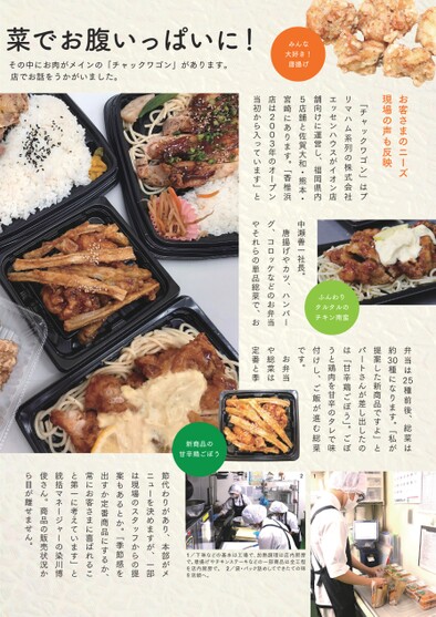 ふんわりタルタルのチキン南蛮中瀬善一社長。唐揚げやカツ、ハンバーグ、コロッケなどのお弁当やそれらの単品総菜で、お5種前後、総菜は弁当は20種になります。「私が約3提案した新商品ですよ」とパートさんが差し出したのは「甘辛鶏ごぼう」。ごぼうと鶏肉を甘辛のタレで味付けし、ご飯が進む総菜です。お弁当や総菜は定番と季新商品の甘辛鶏ごぼう211/下味などの基本は工場で、加熱調理は店内厨房で。唐揚げやチキンステーキなどの一部商品は全工程を店内厨房で。2/袋・パック詰めしてできたての味を店頭へ。7節代わりがあり、本部がメニューを決めますが、一部は現場のスタッフからの提案もあるとか。「季節感を出すか定番商品にするか、常にお客さまに喜ばれること第一に考えています」と統括マネージャーの染川博俊さん。商品の販売状況から目が離せません。お客さまのニーズ現場の声も反映「チャックワゴン」はプリマハム系列の株式会社エッセンハウスがイオン店舗向けに運営し、福岡県内5店舗と佐賀大和・熊本・宮崎にあります。「香椎浜店は2003年のオープン当初から入っています」と菜でお腹いっぱいに!その中にお肉がメインの「チャックワゴン」があります。店でお話をうかがいました。みんな大好き!唐揚げ