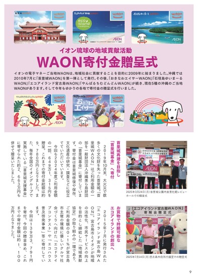 イオン琉球の地域貢献活動WAON寄付金贈呈式イオンの電子マネーご当地WAONは、地域社会に貢献することを目的に2009年に始まりました。沖縄では2010年7月に「首里城WAON」を第一弾として発行。その後、おきなわエイサーWAON」「石垣島ゆいまーるWAON」エコアイランド宮古島WAON」やんばるちむどんどんWAON」が続き、現在5種の沖縄のご当地WAONがあります。そして今年もゆかりの各地で寄付金の贈呈式を行いました。2025年3月24日(月)首里城公園内首里杜館レビューホールでの贈呈式2025年7月14日(月)宮古島市役所庁議室での贈呈式9首里城再建を目指し「首里城基金」へ寄付2019年10月末、大火災で数多くの文化財を失った首里城。首里城WAON」はご利用金額の一部を一般財団法人沖縄美ら島財団の「首里城基金」に寄付しています。寄付金は首里城修復や保存、文化遺産の研究・調査などに役立てていただいています。今回も2024年度ご利用金額の一部、649万1、315円を贈呈。これまでの寄付金総額は約9、780万円となりました。また、毎年全国のイオングループで実施している「首里城支援募金」に寄せられた約2、663万円も併せて贈呈いたしました。お買物で持続可能なエコアイランドの創出へ2015年7月に発行された「エコアイランド宮古島WAON」。宮古島市とイオンが地域の活性化、市民サービスの向上を目的とし締結した「地域貢献協定」の取り組みの一環であり、ご利用金額の0・1%が宮古島市主催の環境に優しいクルマ社会づくりへ向けた「エコドライブコンテスト」や「エコハウス普及啓発事業」等に寄付しています。今回は139万3、791円を寄付。今回の贈呈含め、これまでの寄付金額は約1、100万円となりました。