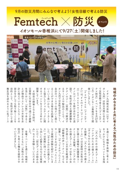 9月の防災月間にみんなで考えよう!女性目線で考える防災防災イベントFemtechフェムテックイオンモール香椎浜にて9/27(土)開催しました!地域のみなさまと共に考える「女性のための防災」11イオン九州株式会社(以下イオン九州)は防災月間に合わせて女性目線で考える「フェムテッ7日ク×防災」イベントを9月2(土)イオンモール香椎浜にて開催いたしました。「Femtech(フェムテック)」は、Female(フィメール)とTechnology(テクノロジー)を掛け合わせた造語で、女性が抱える健康課題をテクノロジー(技術)で解決するサービスや製品のことで、イオン九州では女性が自分らしく、自分のペースで心地よいと感じることができる毎日を応援したいという思いから、メーカーさまと協力してフェムテックに関するイベントを2024年から開催しています。4回目の開催となる今回は、災害時に不安の中で過ごす避難生活において「女性」であることが理由でストレスや不安を余計に抱えているとしたら…その部分を少しでも取り除くことを目的として、女性が安心して避難生活を送れるように各ブースを通じて情報を発信し考えるきっかけになるイベントを目指しました。「大人のための備えブース」「シニアのための備えブース」「子どものための備えブース」を設置し、「大人のための備えブース」では災害時の女性の不安に備える情報や知識習得コーナーなどを設置。「シニアのための備えブース」では多くの女性が感じている不安を軽減する「経験者の声コーナー」なども設置し、「やってよかったこと」や「こうすればよかったこと」など実際の体験を紹介いたしました。「子どものための備えブース」では実際に持ってみて、持ち出しに必要なものなどを実感いただく「防災グッズの詰め込み」なども体験していただきました。各種イベントを通じて地域の皆さまとともに「女性のための防災」を考える機会を提供させていただきました。