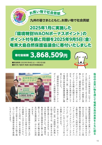 九州の皆さまとともに、お買い物で社会貢献2025年1月に実施した「環境特別WAONボーナスポイント」のポイント付与額と同額を2025年9月5日(金)奄美大島自然保護協議会に寄付いたしました毎日のお買い物を通じて奄美大島の未来をともに創る13イオン九州株式会社(以下イオン九州)は今年の1月4日(土)1日(金)の期間に実から1月3施した「環境特別WAONボーナスポイント」のお客さまへのポイント付与額と同額の386万8、509円を寄付金として9月5日(金)に奄美市を通して奄美大島自然保護協議会に贈呈いたしました。「環境特別WAONボーナスポイント」とは期間中に対象の環境配慮型商品をお買い上げいただいたお客さまに寄与されるWAONボーナスポイントと同額が環境保全活動に役立てられる取り組みで、九州内の「イオン」「イオンスタイル」「マックスバリュ」「マックスバリュ・エクスプレス」「ザ・ビッグ」「ホームワイド」において2022年より実施しております。今年の1月4日(土)から11日(金)の期間中に実施し月3た取り組みでは、お客さまのお買物を通じて386万8、509円が集まりました。寄付金は、奄美大島の環境保全に関して課題となっている「希少種の保護及び外来種対策」のために活用されます。環境配慮型商品をお買い上げいただきましたお客さまに心より感謝申し上げますとともに、イオン九州は、今後もお買物を通じてお客さまとともに取り組んでいける環境保全活動を実施してまいります。寄付金総額3,868,509円■実施期間:2025年1月4日(土)〜1月31日(金)■寄付先:奄美市(奄美大島自然保護協議会)お買い物で社会貢献