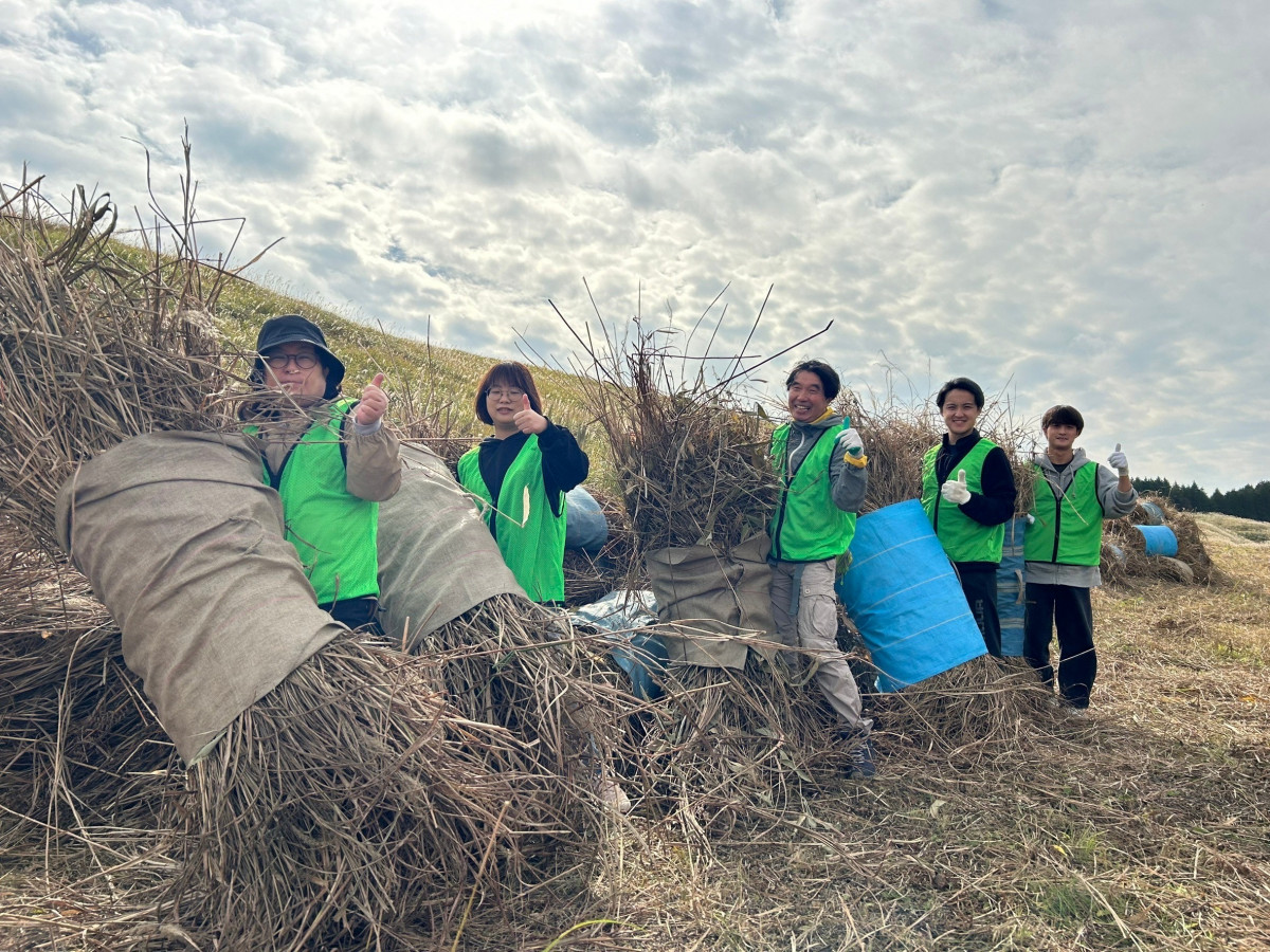 2024年11月9日(日)にイオン九州の従業員35名が、雄大な阿蘇の草原を守るため阿蘇グリーンストックさまご指導のもと「阿蘇草原保全活動」に参加しました。はじめに阿蘇グリーンストックさまより、阿蘇草原のこと、そして草原景観維持に必要な「野焼き」などの活動についての座学を行い、阿蘇の自然を守ることの重要さを学びました。その後草原に移動し、あか牛のエサとなる牧草を一生懸命収集し、牛舎で保管できる状態にまでしました。
