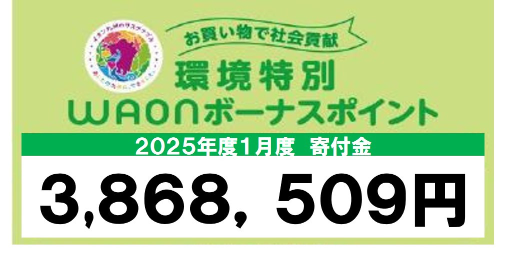 イオン九州は、2025年1月4日(土)から1月31日(金)の期間に実施した「環境特別WAONボーナスポイント」のお客さまへのポイント付与額と同額の386万 8,509円を寄付金として奄美市を通じて奄美大島自然保護協議会に贈呈いたしました。