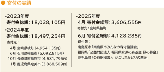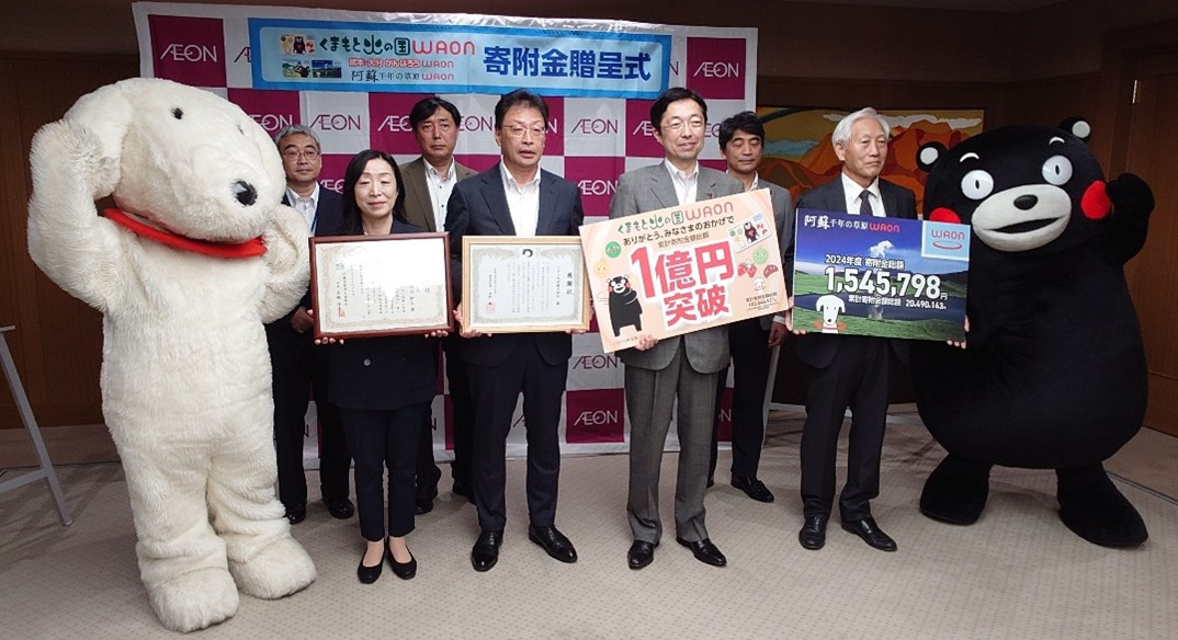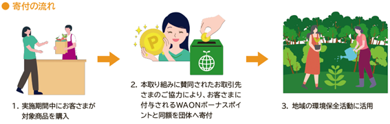 2022年からスタートしたイオン九州独自の取り組み「環境特別WAONボーナスポイント」は、実施期間中に対象の環境配慮型商品をお買い上げいただくと、本取り組みにご賛同いただけるお取引先さまのご協力により、お客さまに付与されるWAONボーナスポイントと同額が団体へ寄付される取り組みです。寄付金は各地域の環境保全活動に役立てられています。